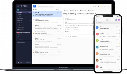 Titan, es la plataforma de correo electrónico mejor calificada para pequeñas empresas, es un servicio de correo electrónico empresarial profesional, sólido y confiable que te permite mantener tu comunicación sin importar dónde estés.